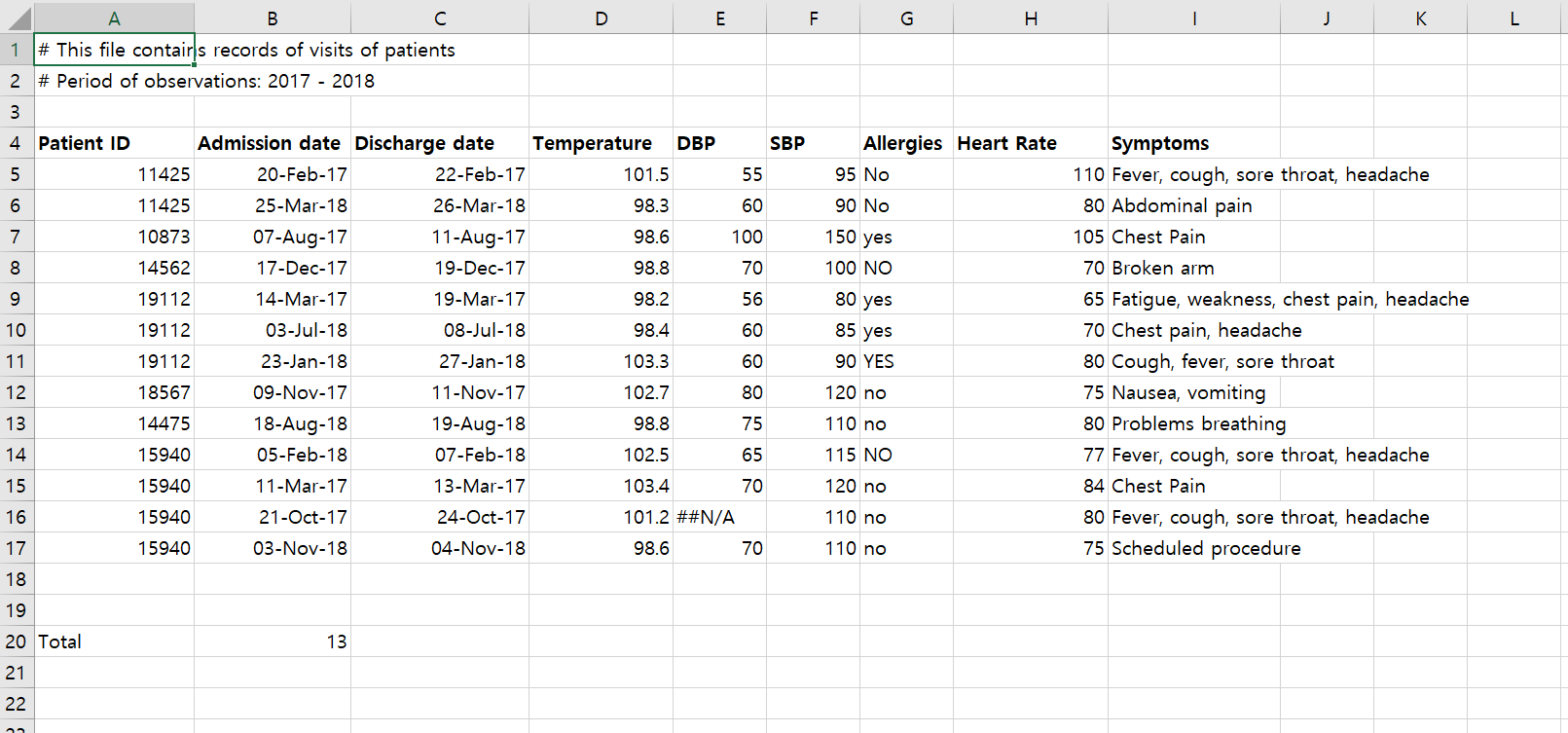 간단한 예로, 아래의 데이터시트는 병원에 방문한 환자에 대한 정보를 포함하는 데이터이다.