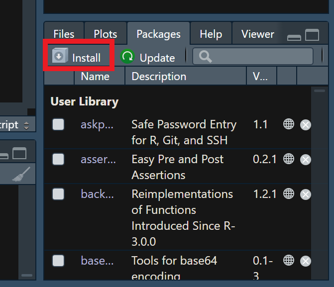 R studio를 사용하고 있다면 오른쪽 아래의 Packages 탭에서 Install을 클릭하여 패키지 이름을 입력하여 설치할 수도 있다.