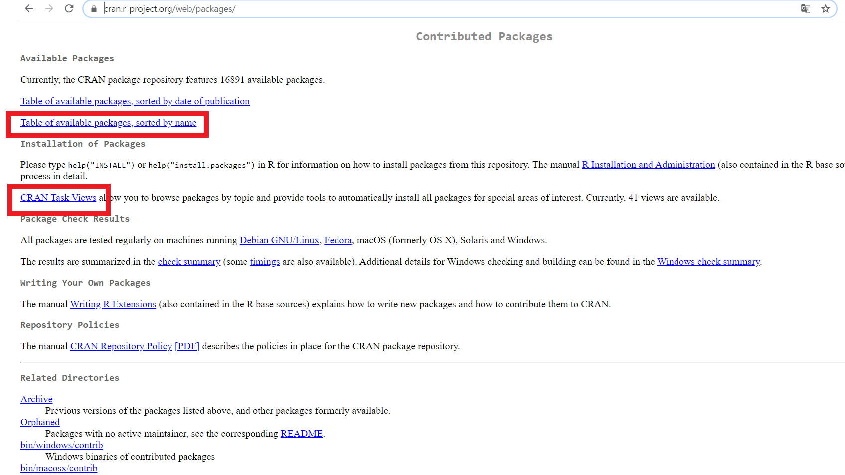 찾고자 하는 패키지의 이름을 알고 있다면 Table of available packages sorted by name을 클릭한 후 [ctrl]+F 를 사용하여 패키지를 검색할 수 있다.