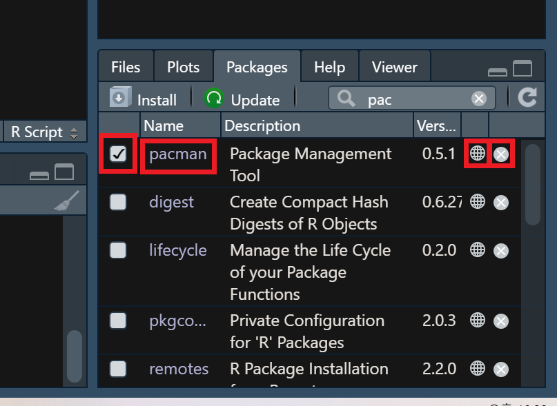 하지만 R스튜디오를 설치하였다면 패키지 관련 기본 작업들은 오른쪽 아래의 Packages탭에서 할 수 있다.