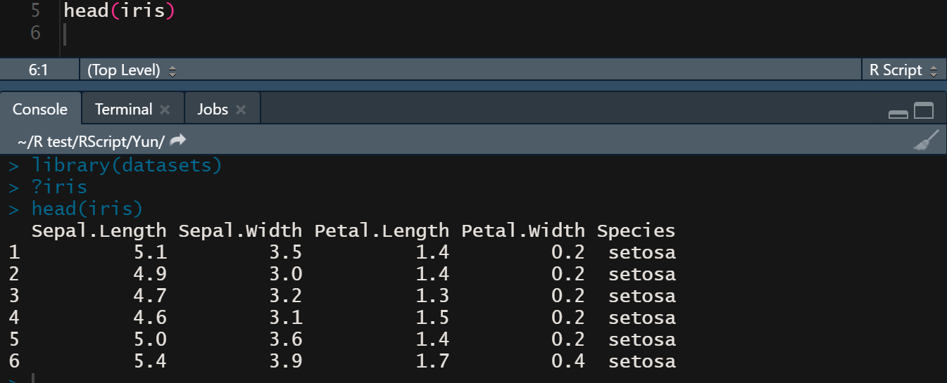 위처럼 head(iris)를 실행하니 6개의 꽃 개체에 대한 Sepal.Length (꽃받침 길이), Sepal.Width (꽃받침 넓이), Petal.Length (꽃잎 길이), Petal.Width(꽃잎 넓이), 그리고 Species (어떤 종인지)를 보여준다.