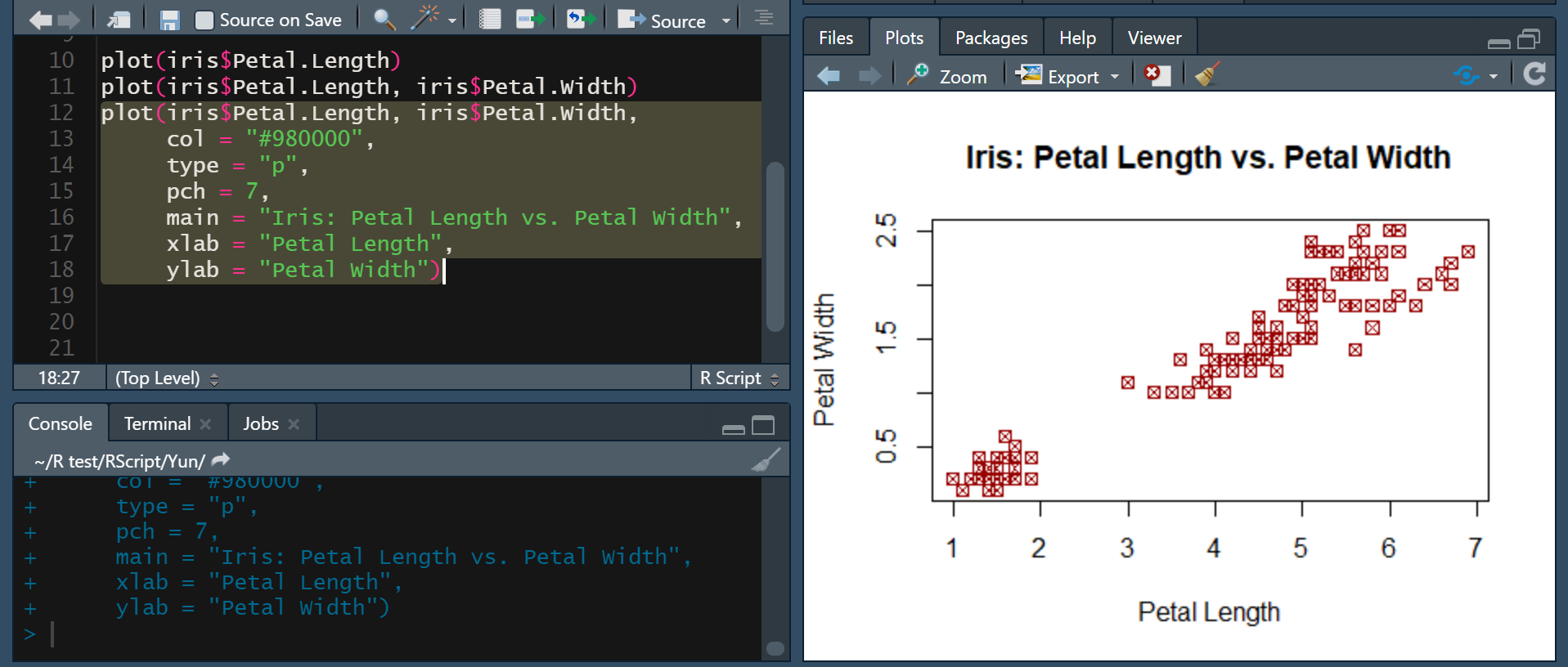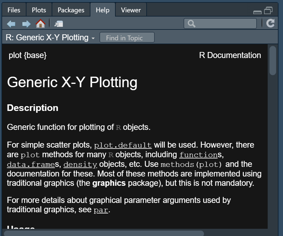 이 이외에 plot에 대해 더 알고싶다면 ?plot 을 입력하여 help탭에서 설명을 볼 수도 있다.