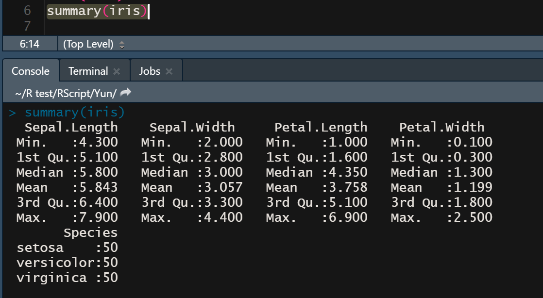 summary(iris) 를 입력하니 각 길이와 넓이의 데이터는 숫자 형태이기에 6가지 통계 값을 보여주고, Species의 경우는 문자이기에 데이터셋에 해당 품종이 몇 개씩 있는지를 보여준다.