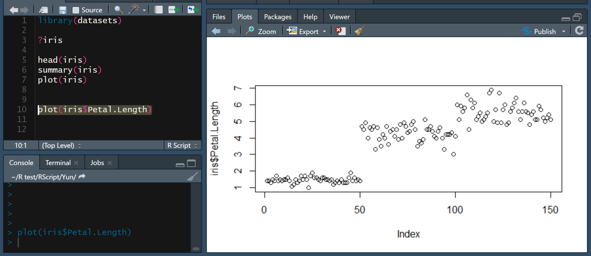 plot(iris$Petal.Length) 를 입력하니 Petal.Length의 값들이 어떻게 분포되어있는지 보여준다.