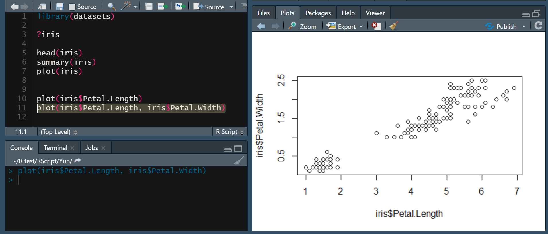 plot(iris$Petal.Length, iris$Petal.Width) 를 입력하여 x축은 꽃잎 길이, y축은 꽃잎 넓이를 보여주는 분포도를 얻었다.